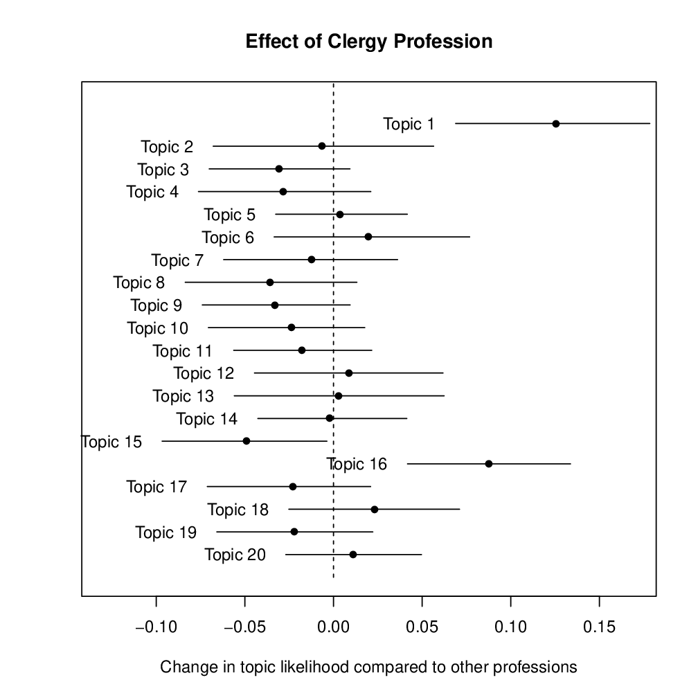 UploadedChange in likelihood that a letter on a given topic was written by an author in the clergy compared to all professions