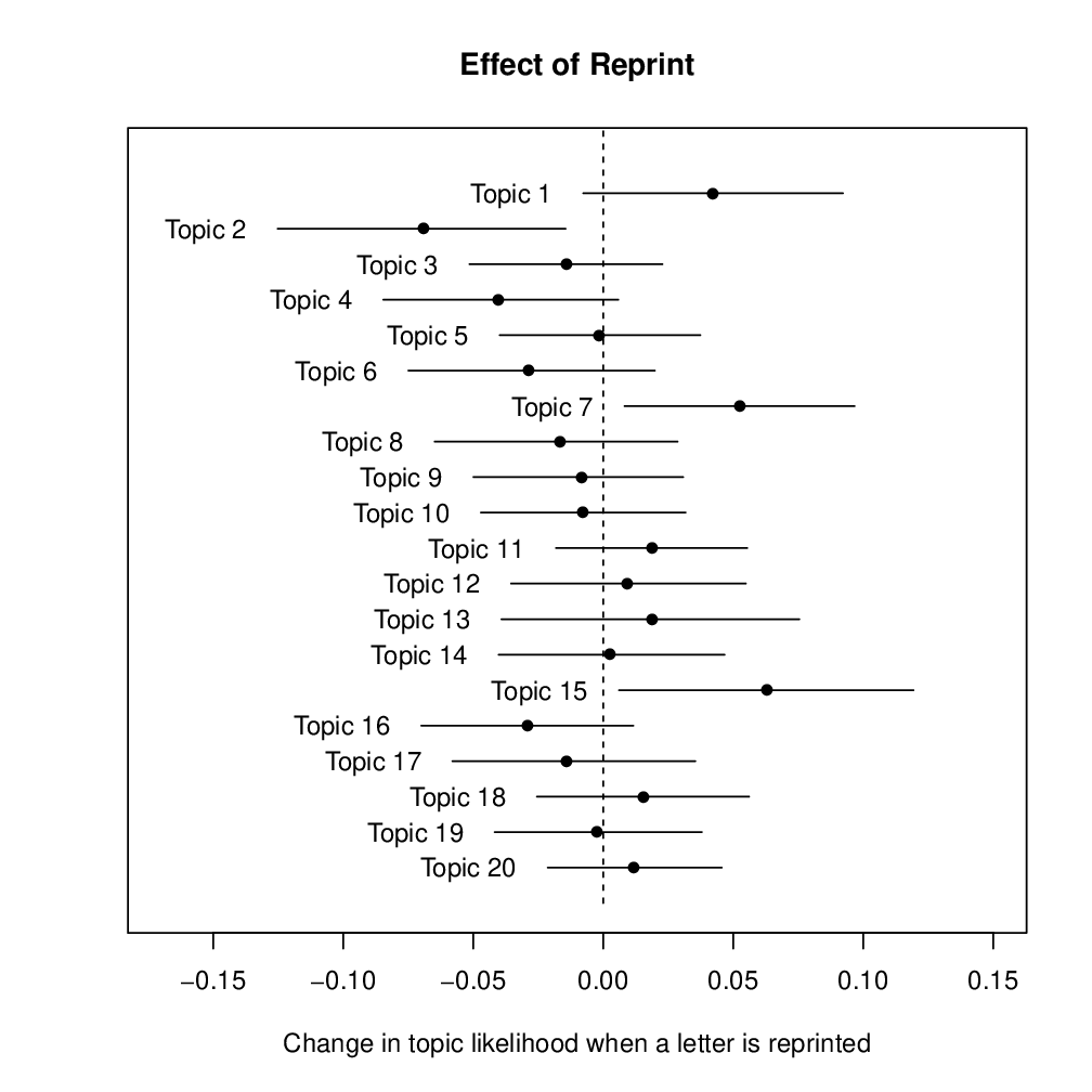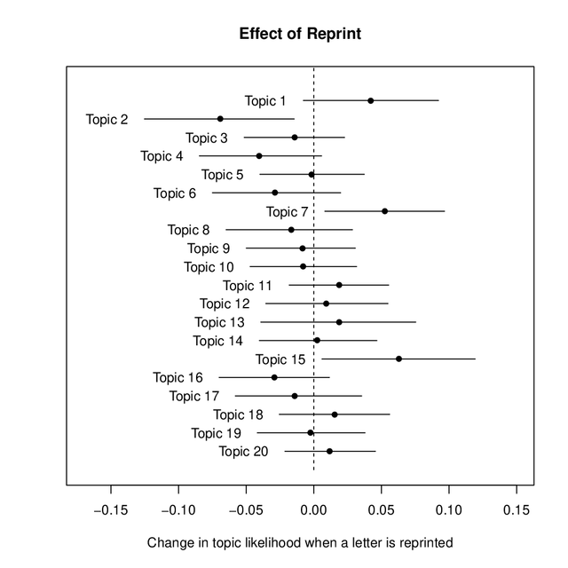 UploadedChange in likelihood that a letter on a given topic was a letter reprinted from another periodical, compared to all letters published