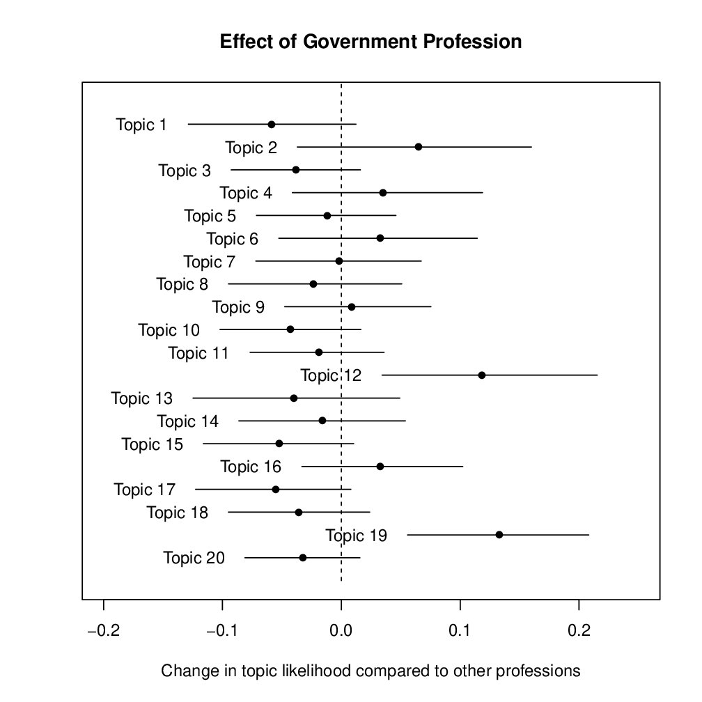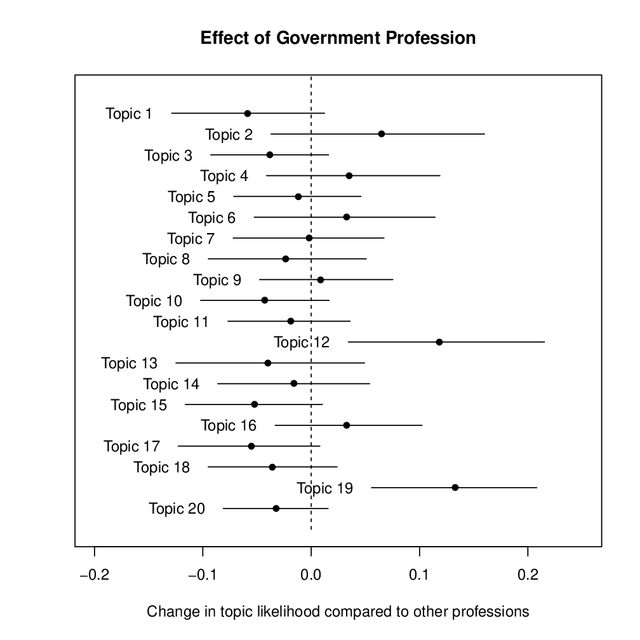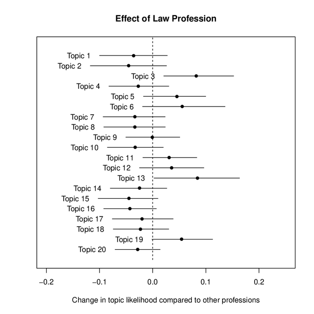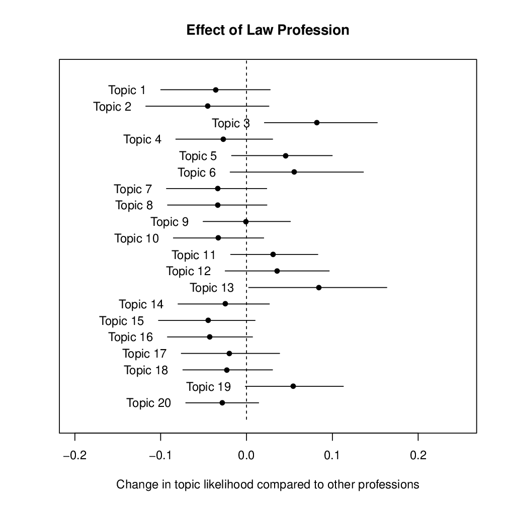 UploadedChange in likelihood that a letter on a given topic was written by an author in the legal profession compared to all professions