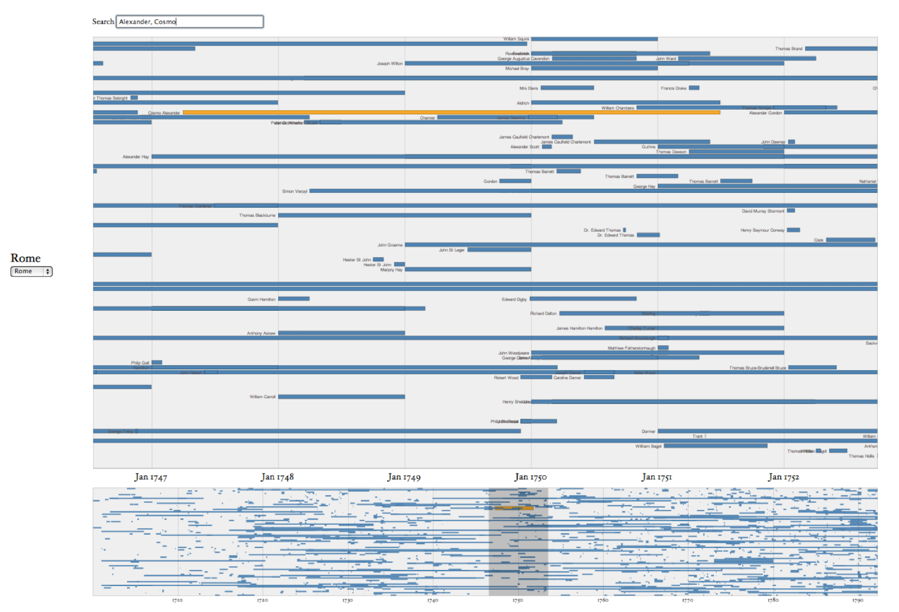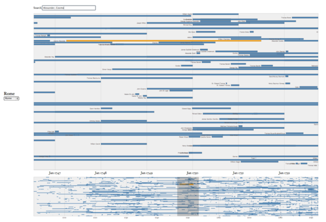 Uploaded UploadedScreenshot of the Priestley Time Chart showing visits to Rome. The period of January 1747-January 1752 is detailed with Cosmo Alexander’s visit highlighted