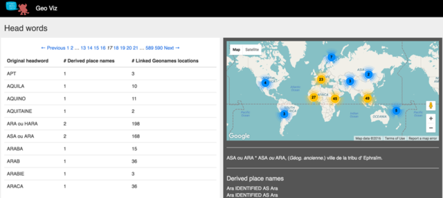 Screenshot of GeoViz. String match returns 168 Geonames record locations for 'Asa'