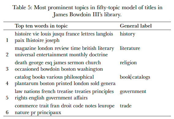 UploadedMost prominent topics in fifty-topic model of titles in James Bowdoin III’s library