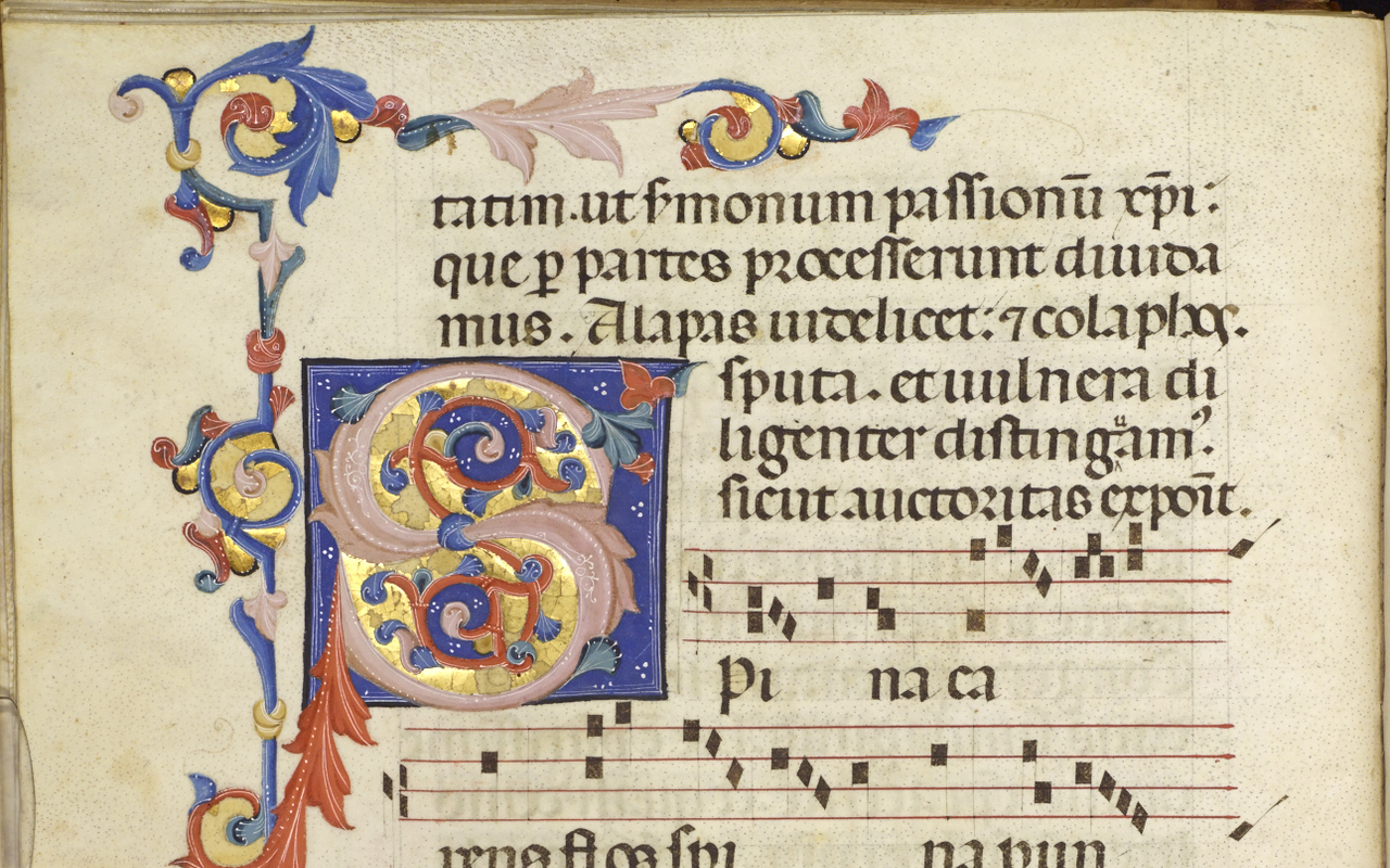 Provenance: Various commentators have proposed that this Antiphoner was originally produced for the church of Santa Maria della Spina in Pisa. The church was given that name in 1332 after receiving a relic of the Crown of Thorns; the inside front cover of the volume contains the inscription "Pisa Sept. 1837".