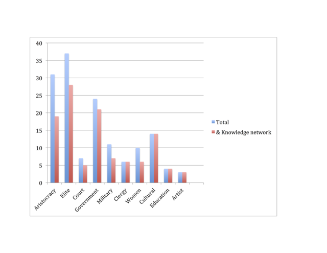 Proportions of knowledge networks in each social demographic. The first bar in each category indicates the number of people in each social or professional group, whereas the second bar designates the number of the individuals in that group who are also in a knowledge network. For example, twenty-four salon attendees were government officials, and twenty-one of those individuals were also gens de lettres.