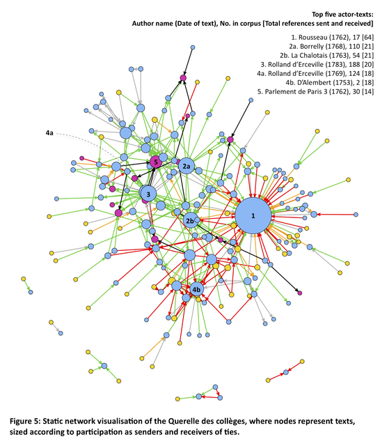 A static network visualisation of the Querelle des collèges, where nodes represent texts as actors of the quarrel. Nodes are sized according to texts' participation in the quarrel as both senders and receivers of ties (in other words, according to the references that a text both makes to other texts, and receives from other texts).