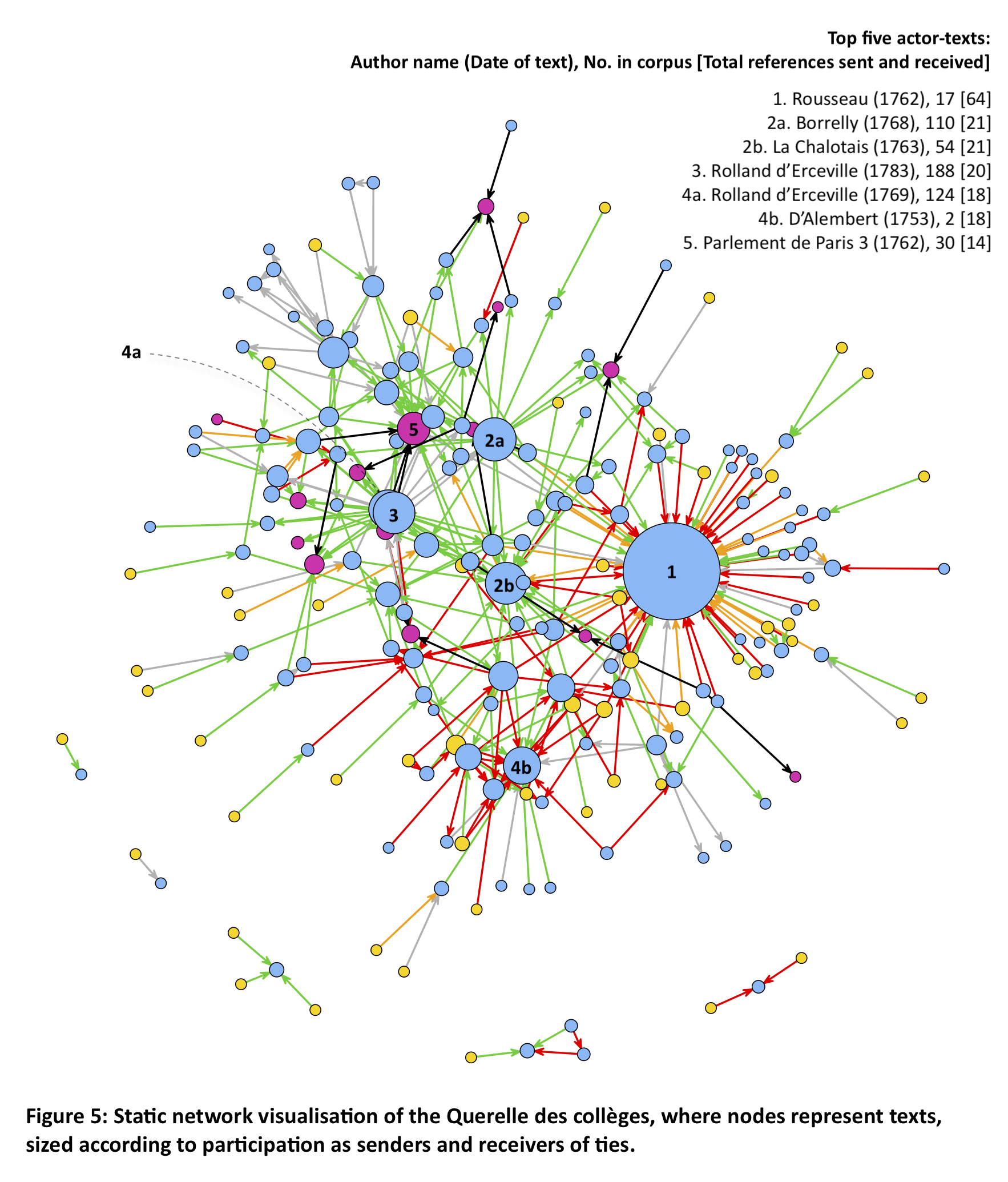 Figure 5: Static network visualisation of the Querelle des collèges, where nodes represent texts, and where node size is a function of ties sent and received.