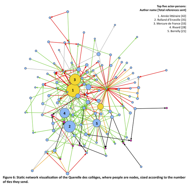A static network visualisation of the Querelle des collèges, where nodes represent people as actors of the quarrel. Nodes are sized according to writers' participation in the quarrel as senders of ties (in other words, according to the references that a person makes to other people).