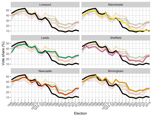 Conservative share of vote in general elections, 1945–2019.