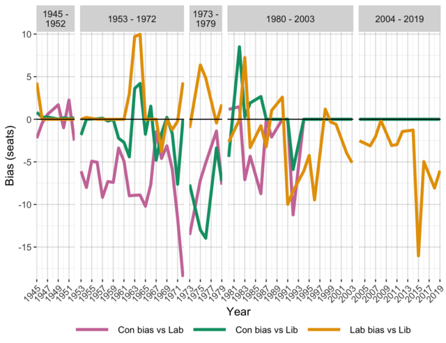 Net bias in seat allocation for Liverpool’s municipal elections, 1945–2019.
