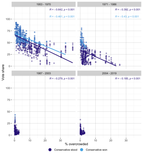 Conservative vote share against the percentage of those living in overcrowded conditions in each ward, with Pearson’s r value.