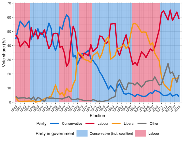 Party vote share in local elections in Liverpool, and party of government, 1945–1973.